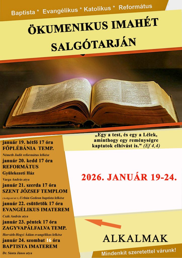 Szeretettel hívunk mindenkit a salgótarjáni ökumenikus imahét alkalmaira január 17-22. között!