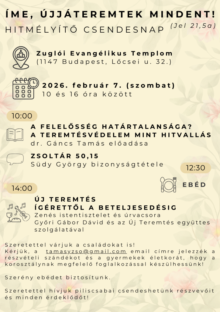 Beszámoló a zuglói csendesnapunkról (2022.02.05.), amelyben az igehirdetések és az előadás hanganyaga is megtalálható.